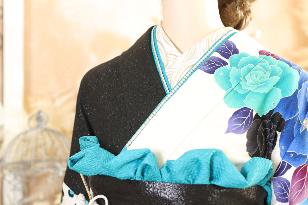 重ね衿は、青いバラ柄に合わせて、鮮やかな青色のものにしました。