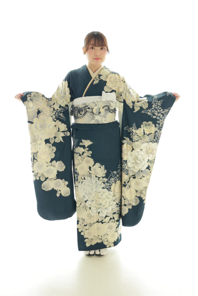 美しい濃紺地に、白やクリーム色の牡丹(ぼたん)が大胆に描かれた華やかなお振袖です。