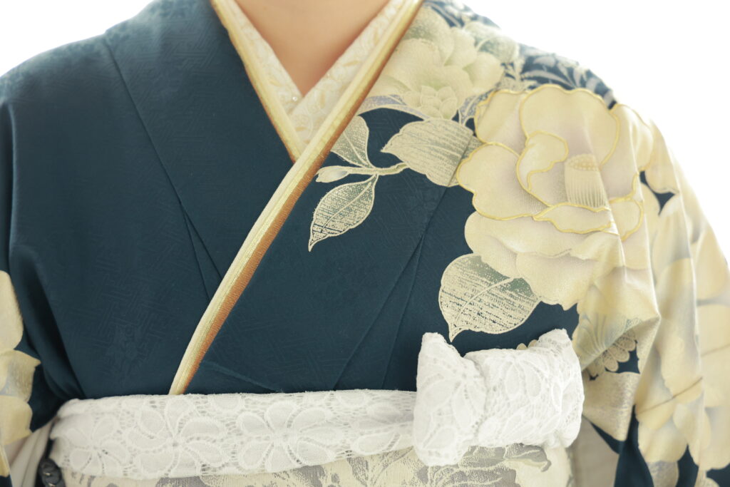 ✅重ね衿…ブラウンの重ね衿は、振袖の濃紺と帯の白の間に挟むことで、柔らかく馴染ませる効果があります。全体がぼんやりせず、引き締まった印象になります。顔まわりに落ち着きと温かみをもたらし、大人っぽさを演出するアクセントになります。