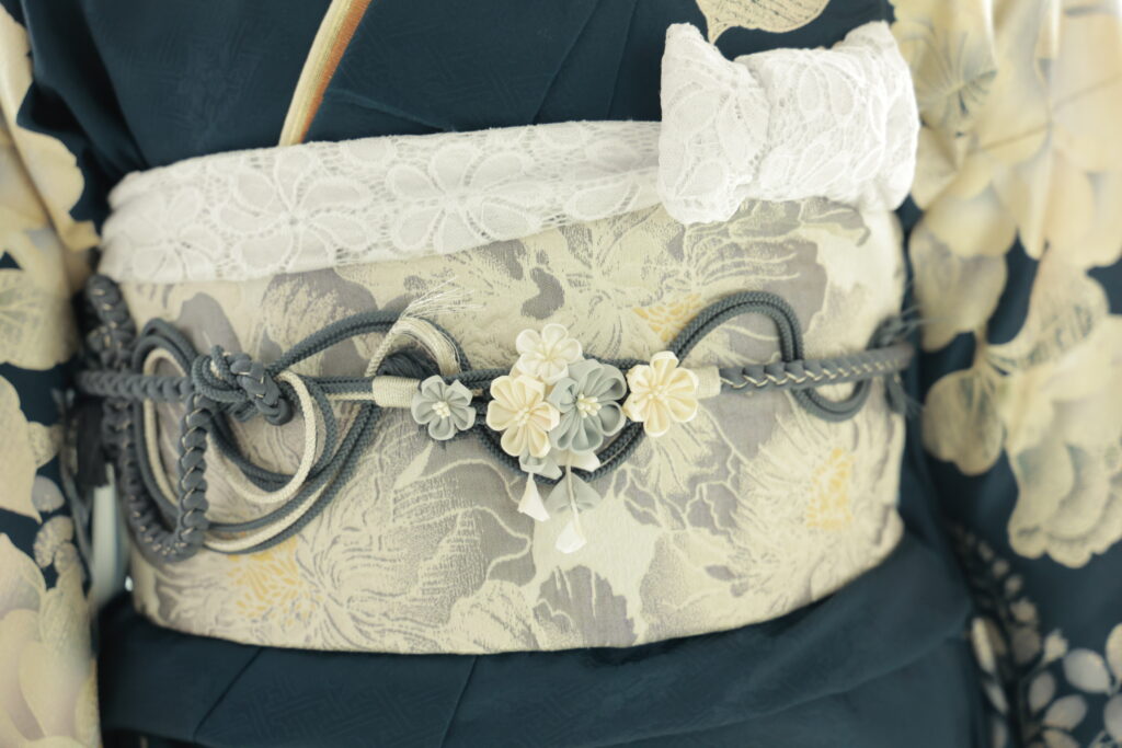 ✅帯締め…グレーにつまみ細工が付いた帯締めは、帯の色と合わせることで、全体にまとまりを持たせます。つまみ細工の立体的なモチーフが、着物姿に動きと華やかさを加えます。伝統的な美しさと現代的な可愛らしさを兼ね備えた、主役級の小物です。