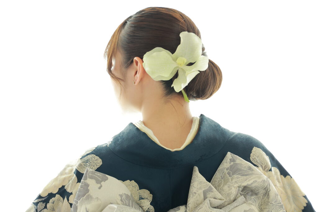これにより、振袖の柄や襟元が際立ち、着物本来の華やかさを引き立てます。また、和装にふさわしい落ち着いた印象を与え、どんな髪飾りとも相性が良いので、個性的なアレンジも楽しめます。