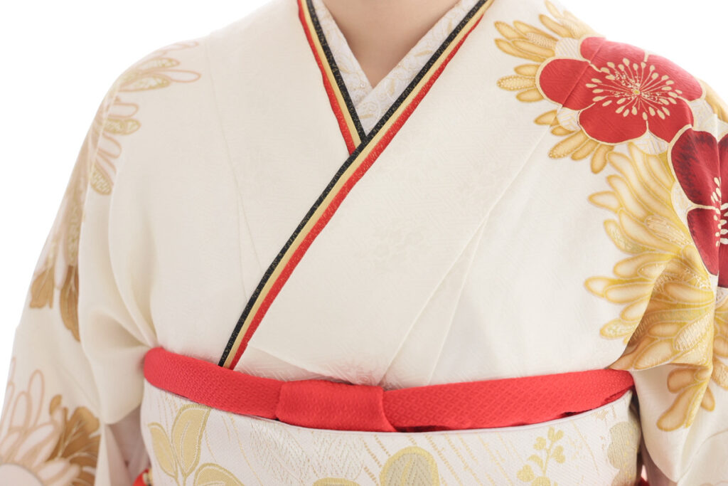 ✅重ね衿…白地の襟元に、黒でキリッと引き締め、振袖の柄にある赤と金で華やかさをプラスしています。この三色は、上品な白地の振袖と、濃い色の帯や帯締めを繋ぐ重要な役割を果たし、顔周りを豪華に彩ります。