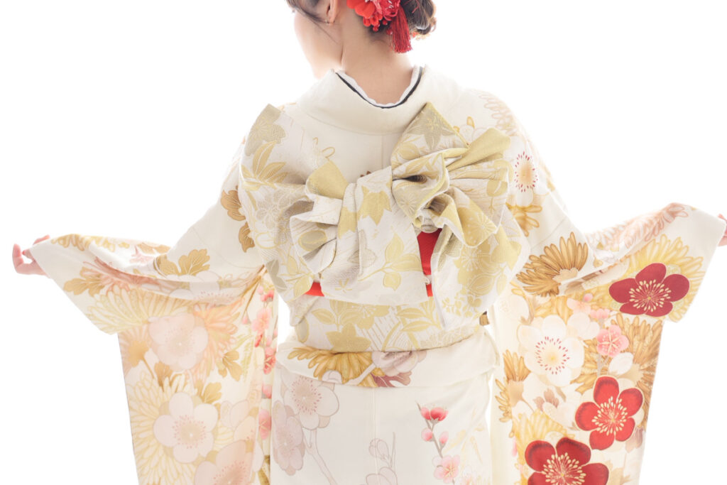 ✅袋帯…振袖の白地と呼応する白地の帯に、淡い金刺繍を施すことで、上品で洗練された印象を与えています。濃い色の帯締めと帯揚げを受け止めつつ、あくまで主役である振袖の柄を際立たせる控えめな華やかさがポイントです。