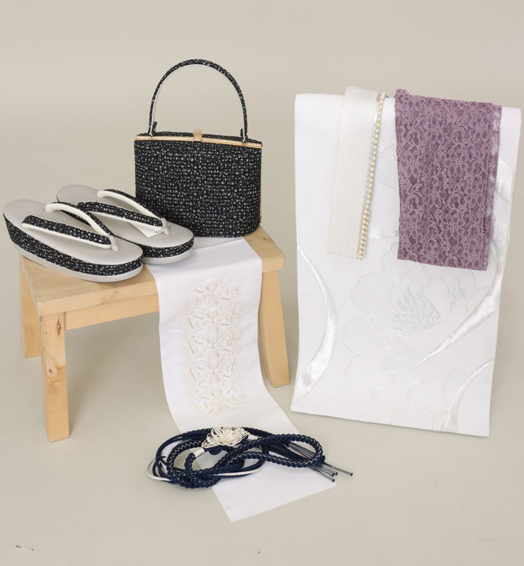 • 帯(おび): あえて**「白・シルバー系」**の帯を合わせました。 濃い地の着物に明るい白の帯を合わせることで、全体の印象が重くなりすぎず、パッと明るい抜け感が生まれます。また、白の帯はレフ板のような効果もあり、お顔周りを華やかに見せてくれます。柄は主張しすぎない上品なものを選び、着物の柄の豪華さを邪魔しないようにしました。