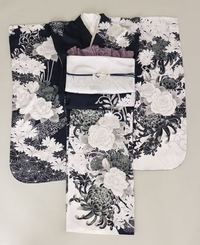 成人式の振袖選びで、近年じわじわと人気を集めているのが**「紺色(ネイビー)」**です。 今回は、深みのある紺色に白のコントラストが美しい振袖のコーディネートをご紹介します。