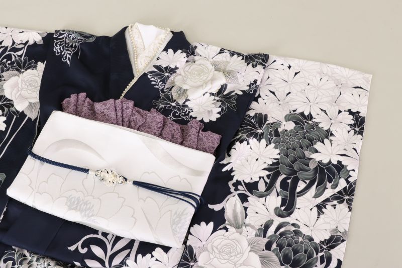 今回ご紹介するのは、紺地に大輪の薔薇(バラ)や菊が大胆に描かれた一着です。全体を寒色系でまとめることで、甘さを抑えた**「クールビューティー」**なスタイルに仕上げました。