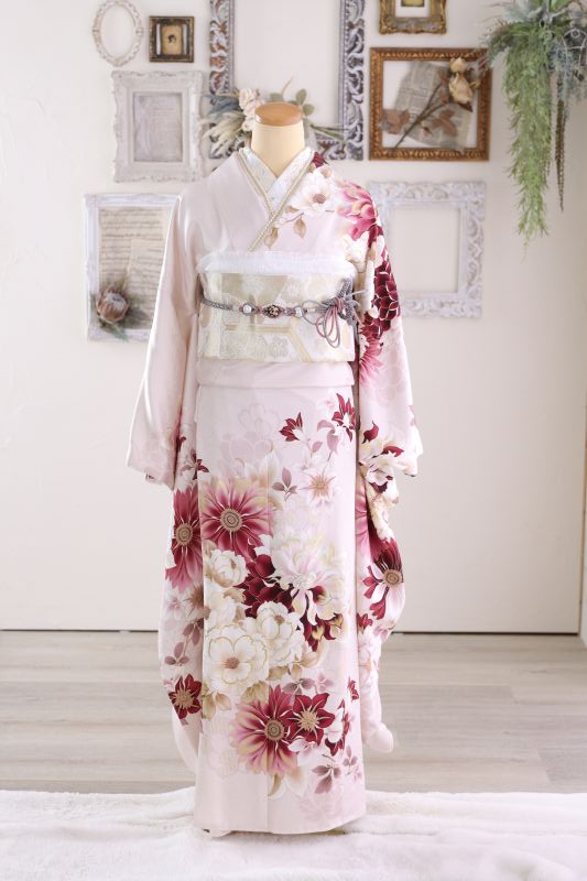 今回ご紹介する振袖は、ただ可愛いだけではありません。少しスモーキーな落ち着いたピンク地に、深みのある赤やボルドーの花柄が入っているため、幼くならず**「大人可愛い」**印象を与えてくれます。