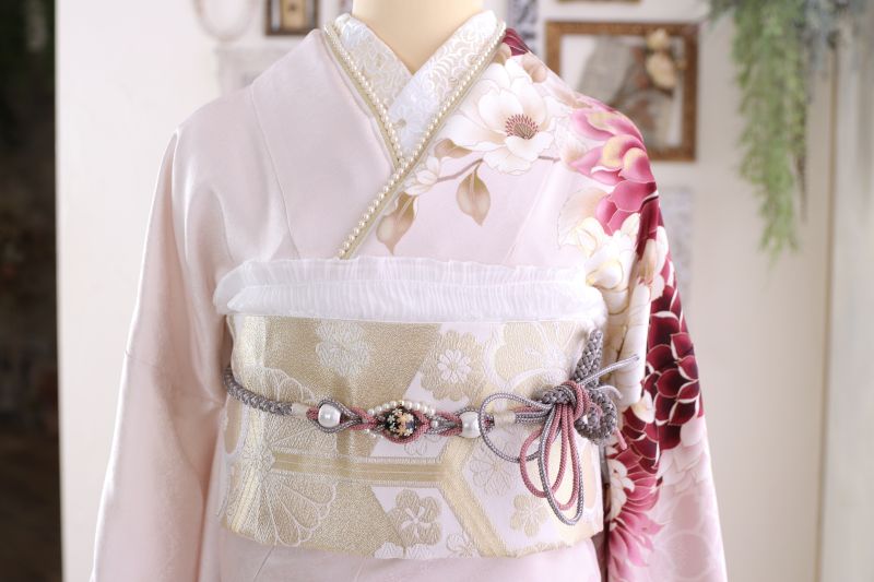 白地にゴールドやシルバーが織り込まれた明るい帯を合わせることで、全体のふんわりとした雰囲気を壊さず、清潔感をプラスしています。淡い色の着物に白い帯を合わせると、今流行の「淡色女子」風の抜け感が生まれます。